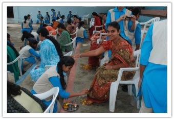 Those emotional moments were followed by honoring the teachers in Priyanka's Playpen by Principal with gifts. Each and every staff member was honoured. Mr.VInayak and Mrs.Murthy honored them with flowers and gifted them with clothes following the tradition of Abhyasa. At the end of the session Mr.Vinayak was blessed by his adored teacher and advisor Mrs.Murthy with flowers and new clothes.