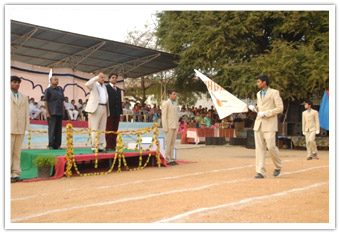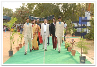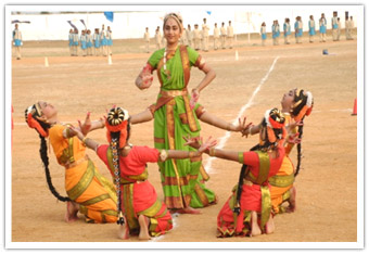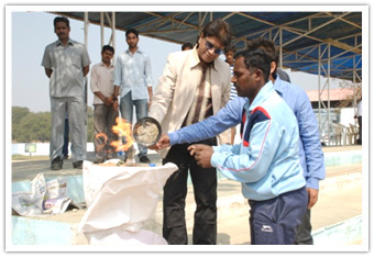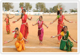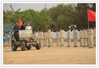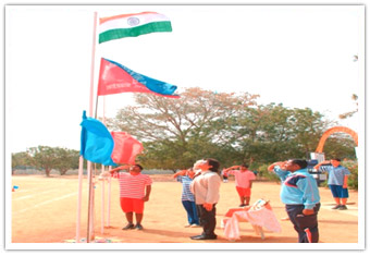 The Highlights of the program were the Welcome dance 'Koyla' - a Tribal dance, Yoga & Kung Fu performance by Students, Flag dance, March past, inspection of the parade by the Chief Guest, track events(finals), Prize distribution and the speeches by Mr.A.S.Sastry (Member - Governing Body), Chief Guest and Mr.Vinayak, Director and Founder Principal. The Chief Guest of the Event was Dr.B.L.Meena, Additional DGP of A.P. The Sports Meet aimed at creating a healthy rivalry and Competitiveness and provided a platform to exhibit the pupils marching skills. The march past was a visual treat with the school students, marching in perfect coordination to the accompaniment of the song "Sare Jahan Se Acha". The school natures the motto "Perfection through Practice" and the students of abhyasa are providing it by displaying their skills in all the fields. The kungfu offered the visual treat of meditation techniques, the tiger pyramid, the mountain pyramid and other feats. The games conducted for the parents gave the much needed enjoyment to the parents who participated in the two games relay race for fathers and potato games for mothers. The flag dance performed by the students was another visual treat with students holding flags of different countries to celebrate the spirit of brotherhood among Nations. The Sports-Meet successfully came to an end with the Chief Guest declaring the meet closed, putting out the flame and handing over the flag to the Principal of the school for safe custody and the singing of the National Anthem.